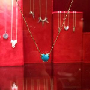 A petite heart pendant necklace in turquoise adds a touch of sparkle to the neck with geometric, glittery appeal. Shop at https://www.PhoenixRoze.com